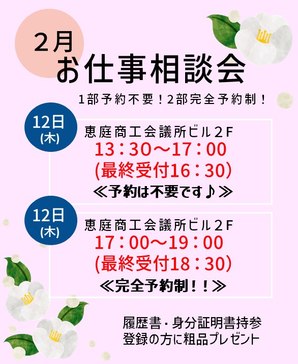 皆さま、こんにちは! 1月に続き、2月もお仕事相談会を開催いたします🎉 今回は、フリーと予約制…