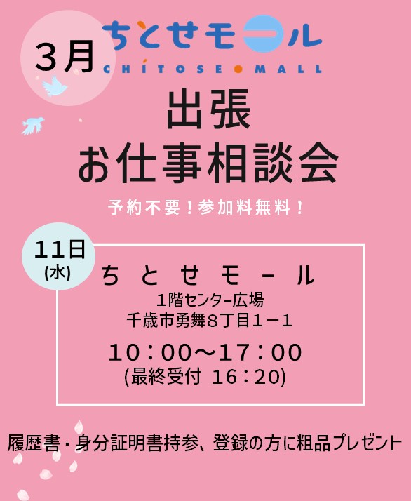 今年初の出張お仕事相談会のお知らせです📢 3月は千歳市のちとせモールで開催いたします…
