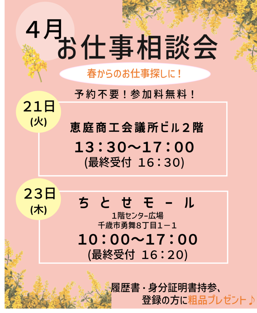 4月も恵庭商工会議所ビルに加え、千歳市のちとせモールでも開催いたします🎉