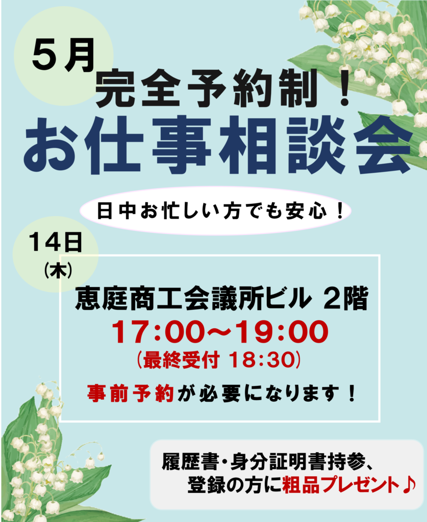 5月14日(木) 恵庭商工会議所ビル2階 ※完全予約制